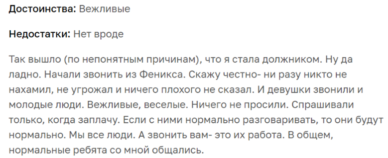 В общем, представители компании концентрируются на долге и действуют как взыскатели, а не как профессиональные кредиторы. С другой стороны, справедливости ради надо отметить, что всё это достаточно умеренные проблемы, так как «Феникс» не желает быть исключенным из реестра официальных коллекторов. Граждане, столкнувшиеся с этим агентством, редко жалуются на грубое поведение коллекторов, которого больше всего боятся должники. Более того, есть и положительные отклики о работе компании: